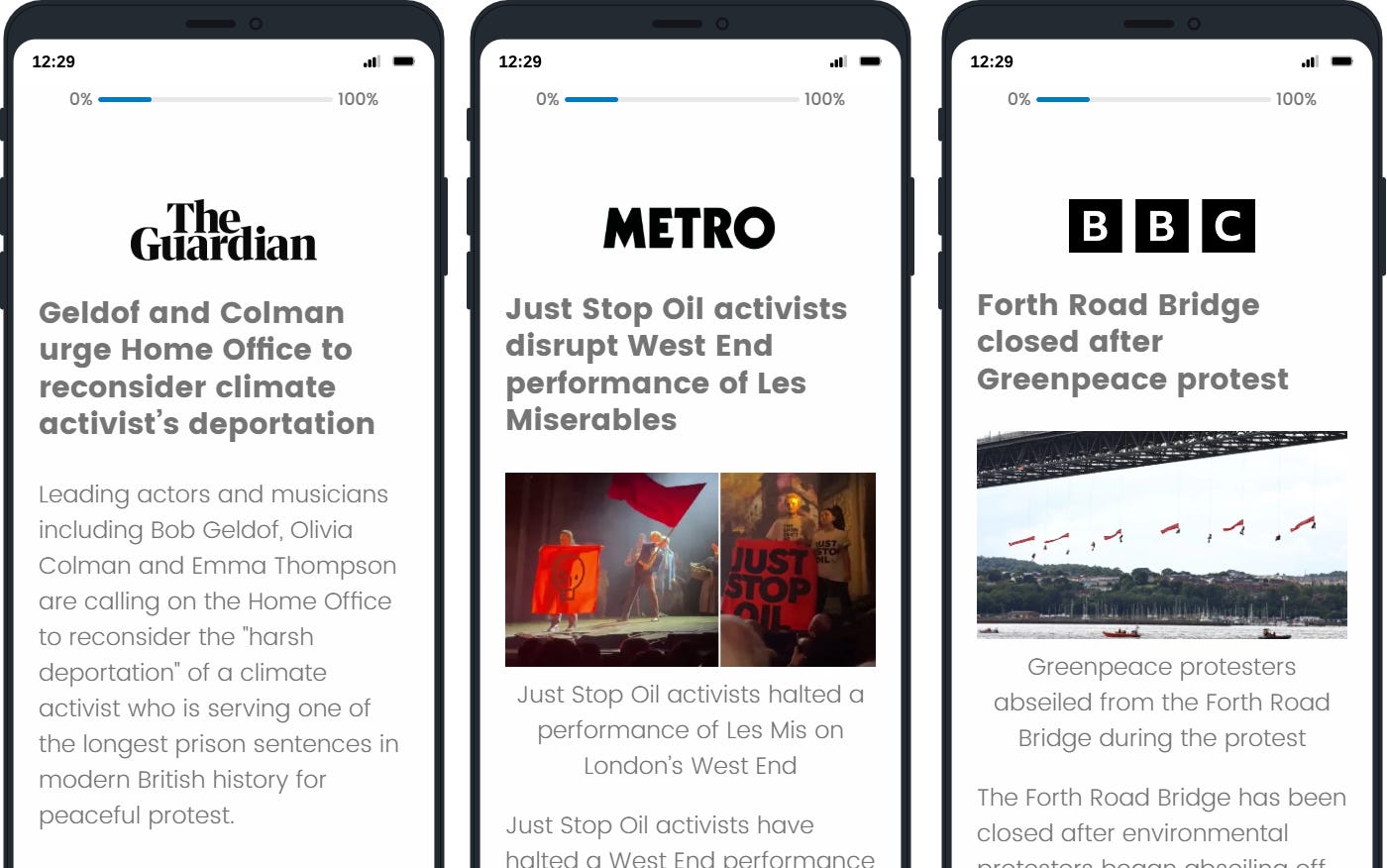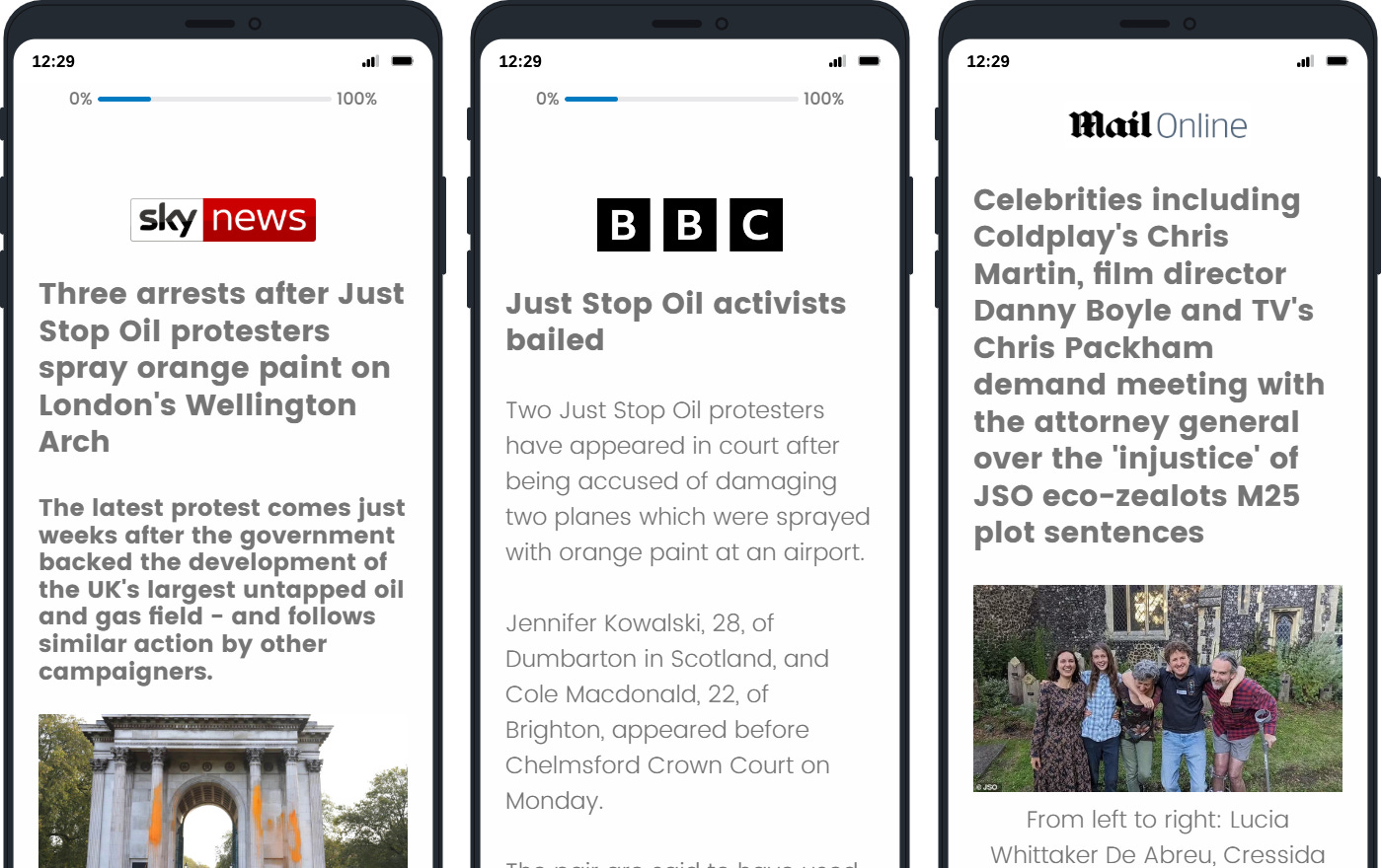 Three more example articles as seen by participants. The six articles included here were randomly chosen from the 100 - it is representative of the material that (1) Just Stop Oil dominates and (2) there is appreciable coverage of harsh legal measures.